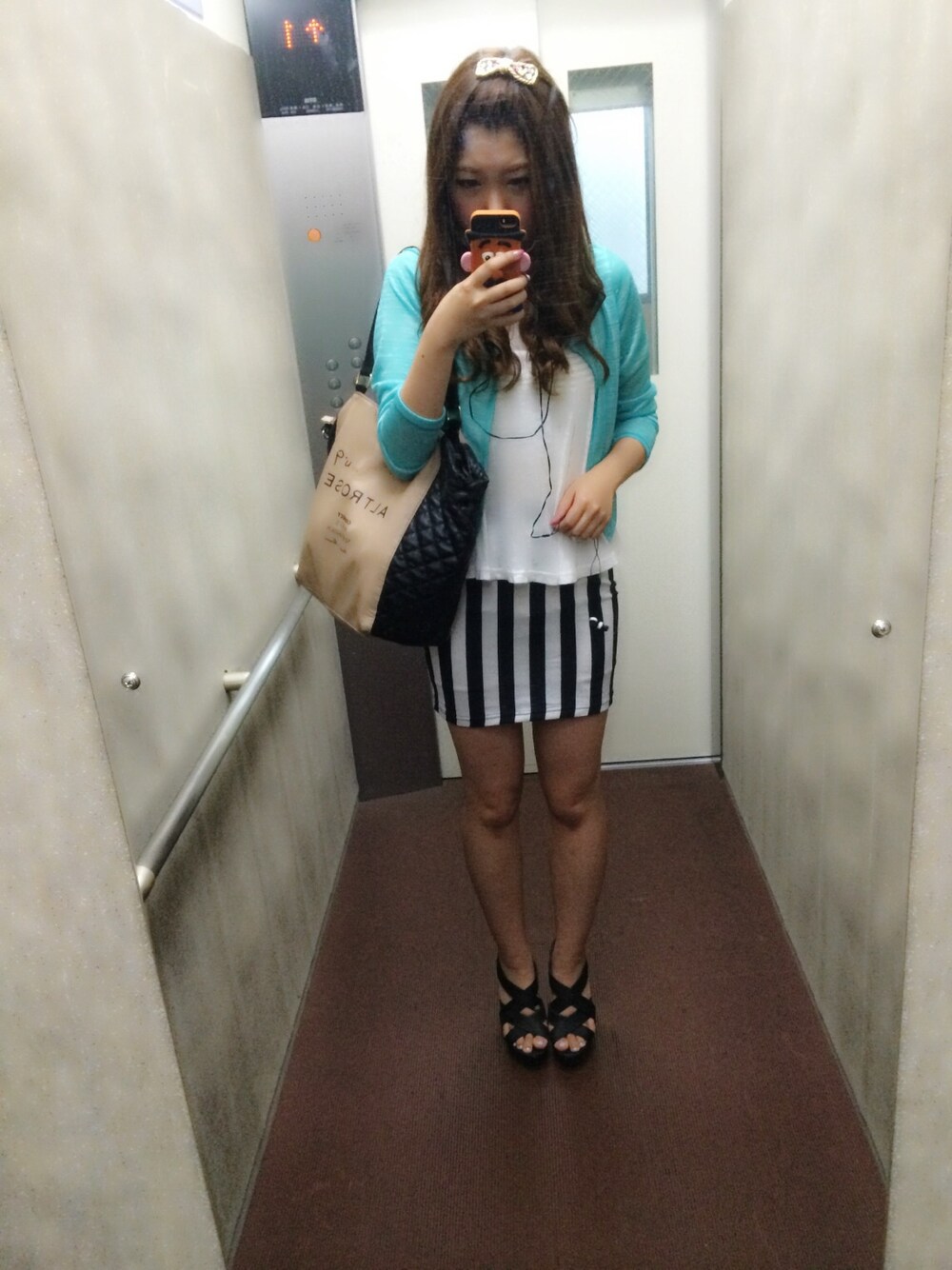 カーディガン:LIP SERVICE トップス:LIP SERVICE スカート:GRL ヒール:R&E バッグ:Pink Mix