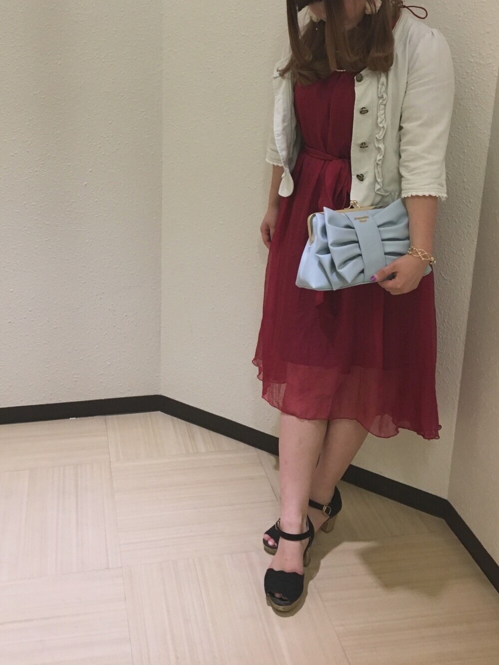 リボンの小さめのバッグで 結婚式やパーティーもo(^_-)o♡♡ なかなか組み合わせない レッド×ライトブルーも ライトブルーで柔らかいイメージに