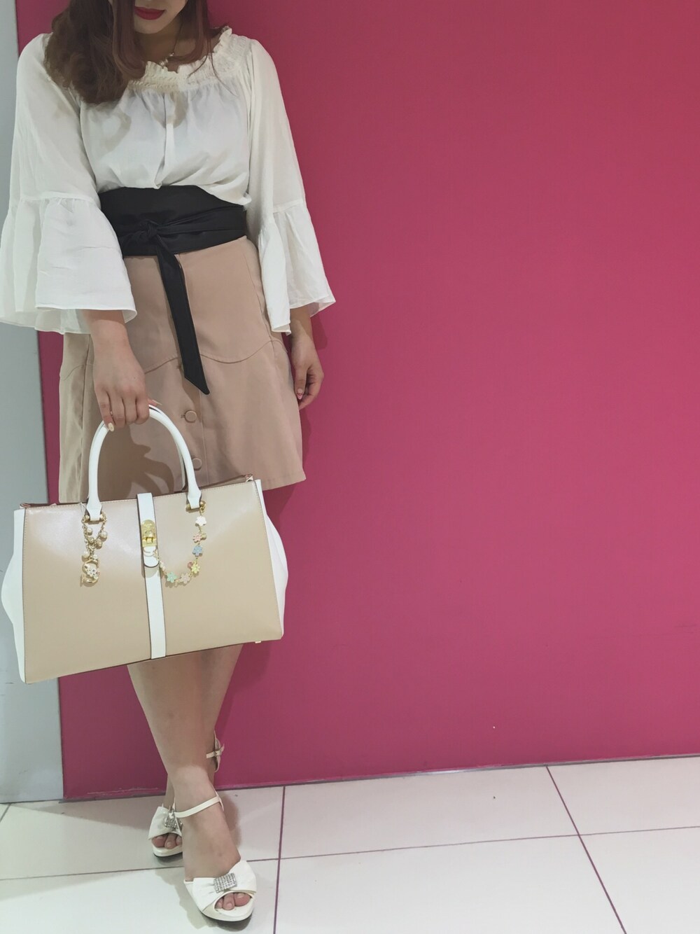 CMで大人気のバッグの限定カラー😶❤️ ホワイト×ピンクの淡い色で合わせて サッシュベルトをブラックで カッチリと締まり感も👌👍