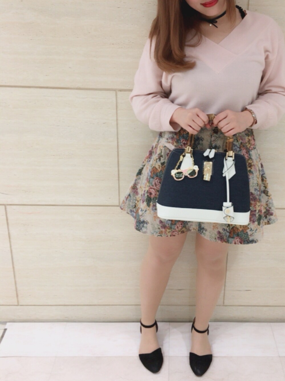 ピンクの薄手の春ニットに ゴブラン織りのスカートを合わせて 甘すぎないようにチョーカーと デニムのバンブーハンドルのバッグを 合わせてカジュアルテイストにしました☺️💗 バッグにチャームを合わせて ポップなイメージに∩^ω^∩💕