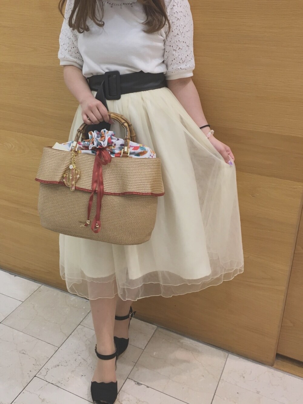 お天気良くてかごバッグを持って 海に行きたい\( ˆoˆ )/ お気に入りのチュールスカートと 袖がレース素材でかごバッグ合わせて 夏先取りコーディネート🍧🌈