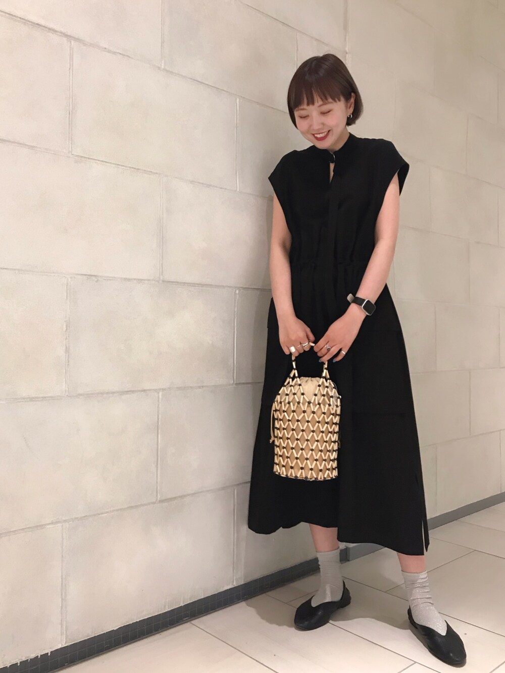 UJOHのブラックワンピにTSURU by Mariko Oikawaのバッグを合わせて涼しげに。 オールブラックだけど重すぎないのがポイントです。