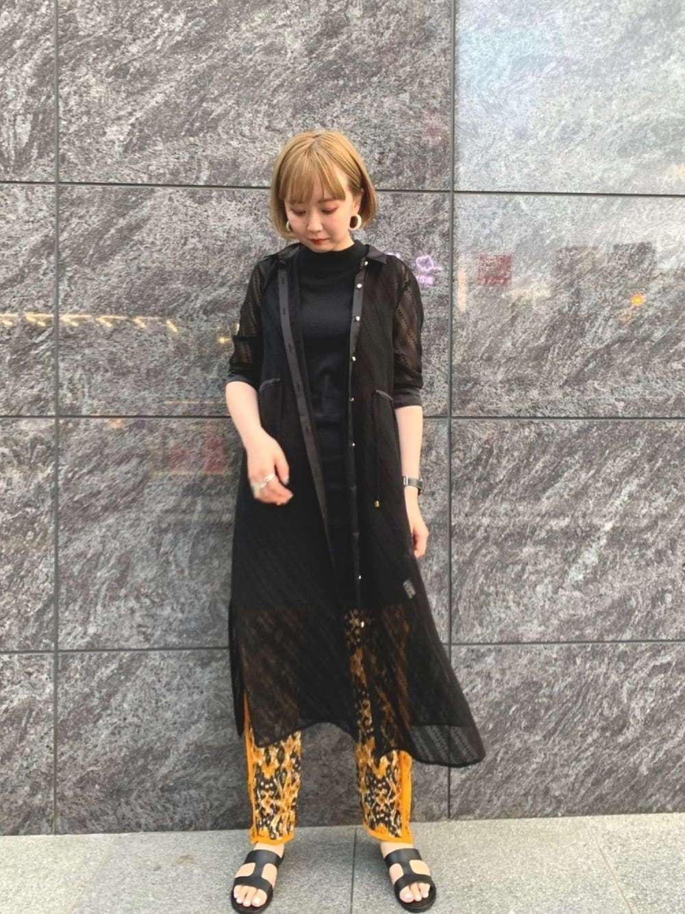 muller of yoshiokuboのパンツをスタイリングのアクセントに。 羽織りのシアーシャツドレスはワンピースとして1着でも着用でき、撥水素材なので梅雨の季節におすすめのアイテムです!
