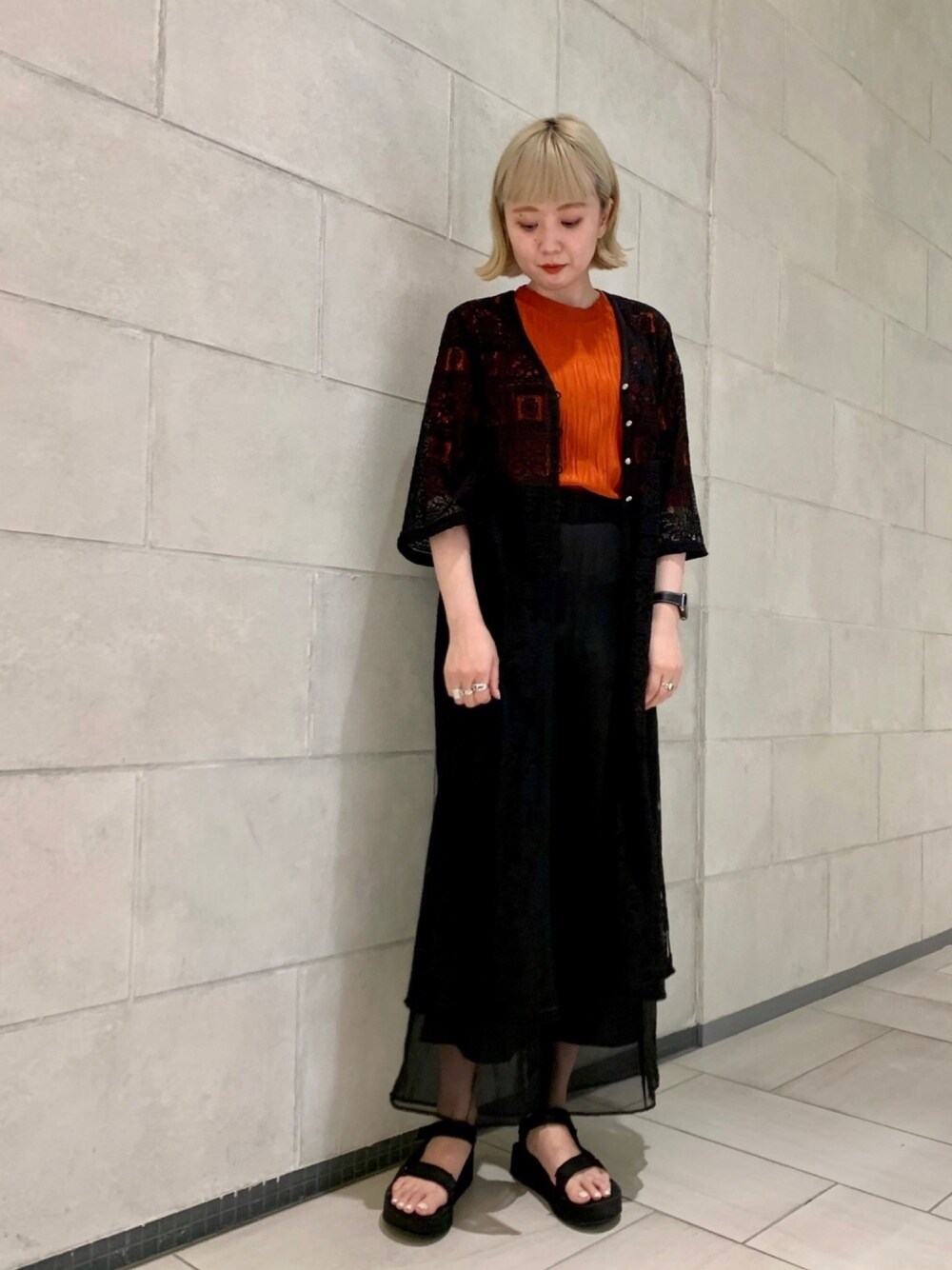人気のグロスプリーツワンピースをパンツにインしてインナーに。 レース羽織りとシアー素材のパンツで重くなりすぎない夏スタイリング。