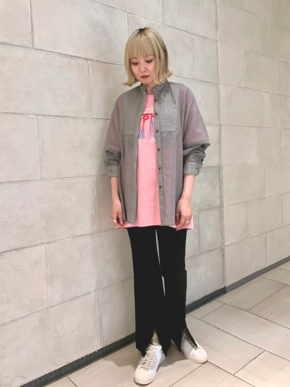 インナーのメンズTシャツに、女性らしいシアーシャツとスリットパンツを合わせたコーディネート。 スリットパンツは美シルエットながらストレッチの効いた履きやすいアイテムです。