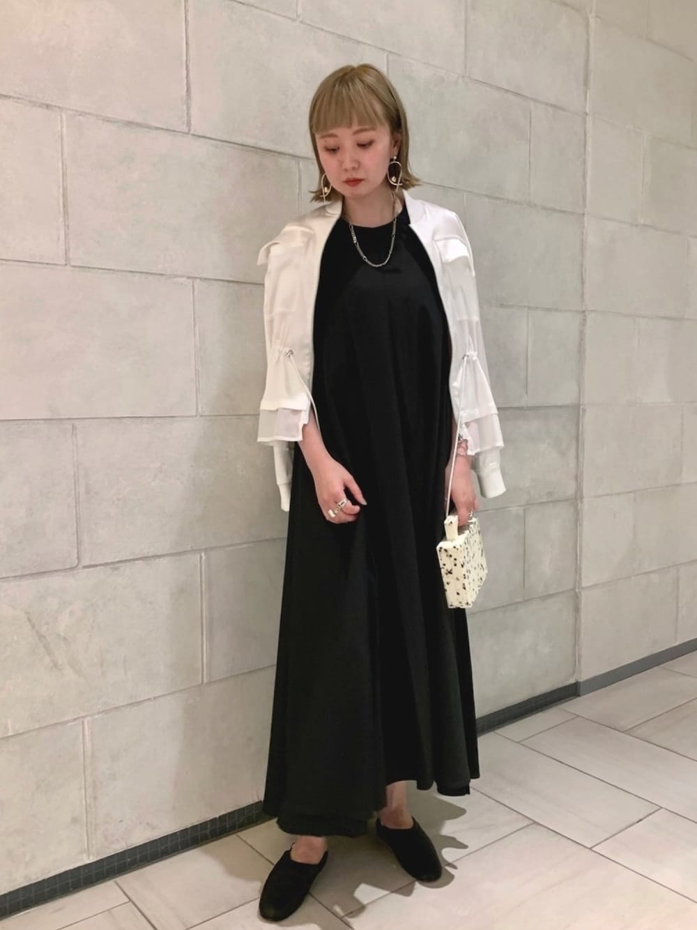新作の"SAYAKA DAVIS"のワンピースにシアーブルゾンを合わせたモノトーンスタイリング。 "RESPIRO"のバッグは、アクセサリー感覚でも持てるオススメアイテムです。