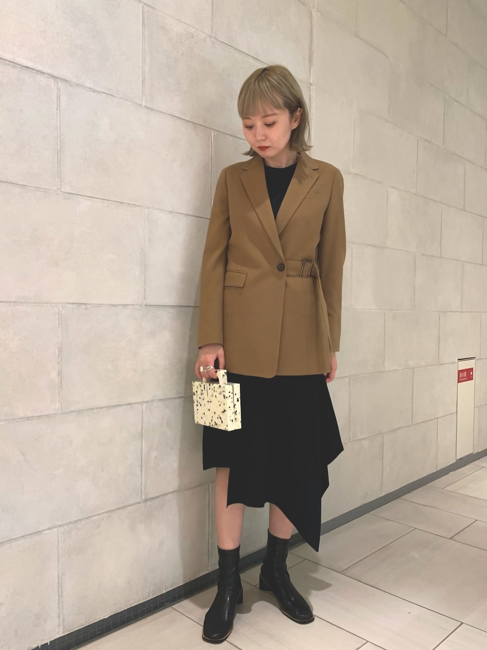 mari .のテーラードジャケット「キャメル ベルテッド セミダブルジャケット」を使ったコーディネート