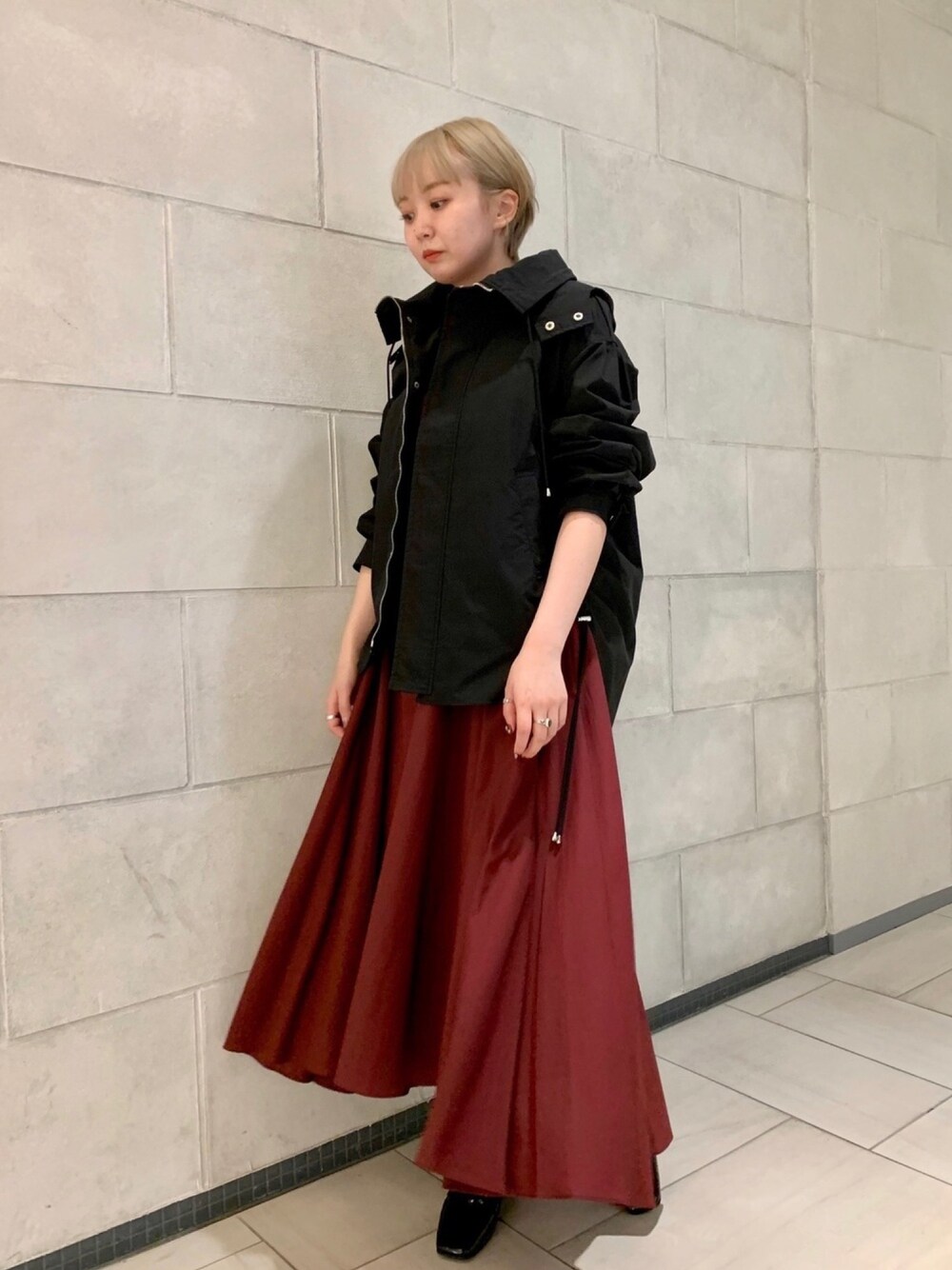 ブラック×レッドのモードなスタイリング。 スポーティなイメージのマウンテンパーカーですが、細かなディテールが女性らしいデザインでワンピースとの合わせもおすすめです。