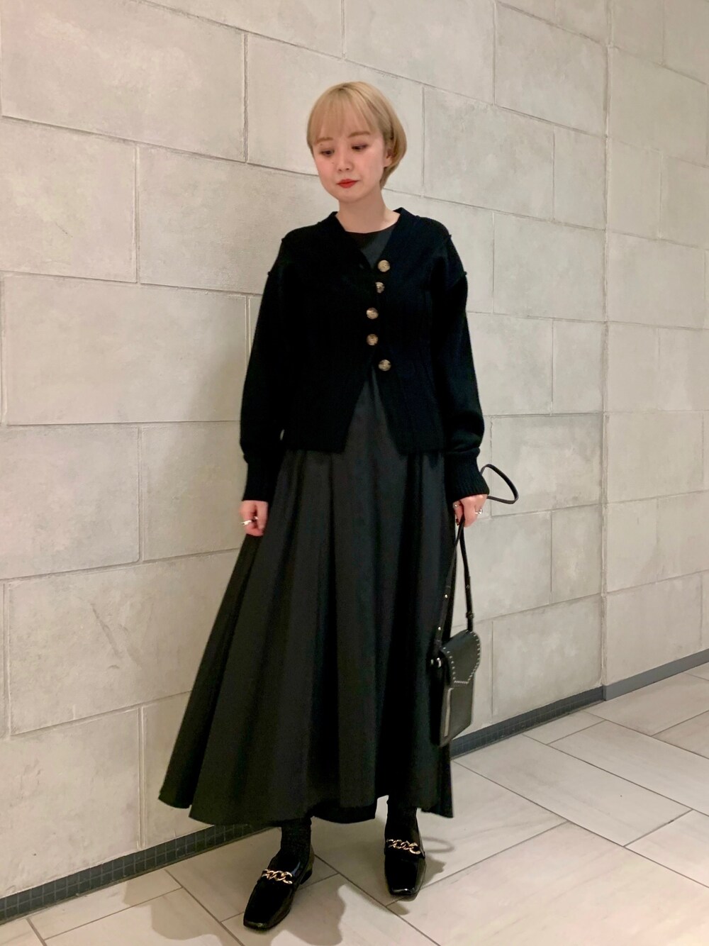 トレンドのオールブラックコーデ。 オールブラックは小物でアクセントをつけるのがオススメです。