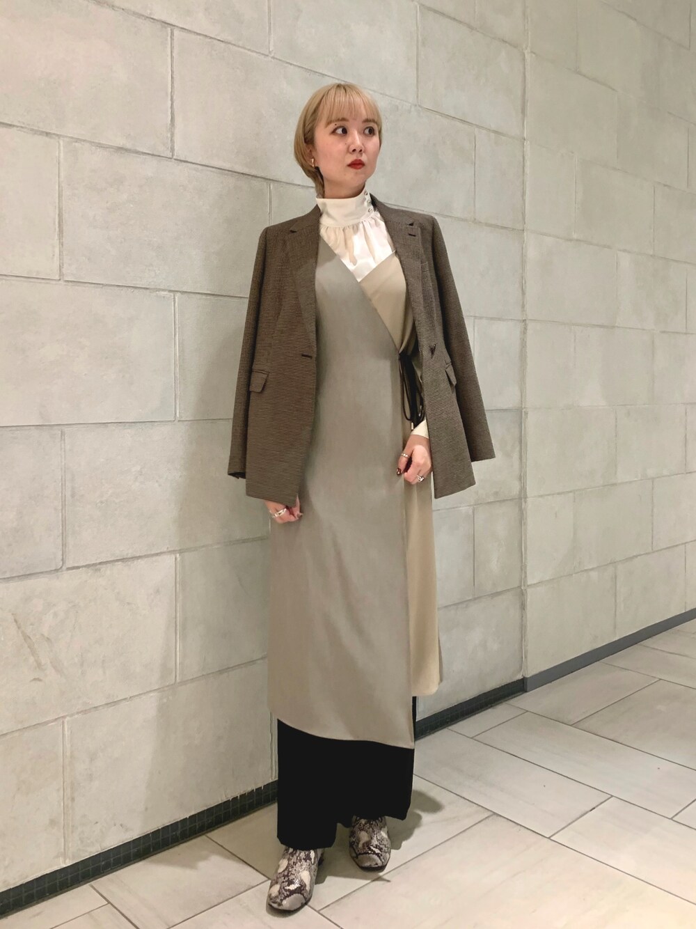 ブラウスとワンピースをレイヤードし、ジャケットを肩から羽織ったスタイリング。 柔らかなブラウンメインのコーディネートですが、ブラックのパンツを合わせることでスタイリッシュに。