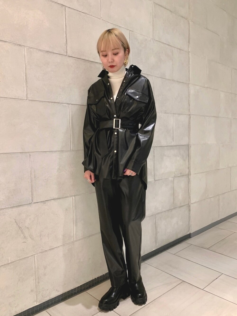 トレンドのレザーをセットアップで。 インナーにはタートルネックのニットを合わせて、モードなスタイリングに。
