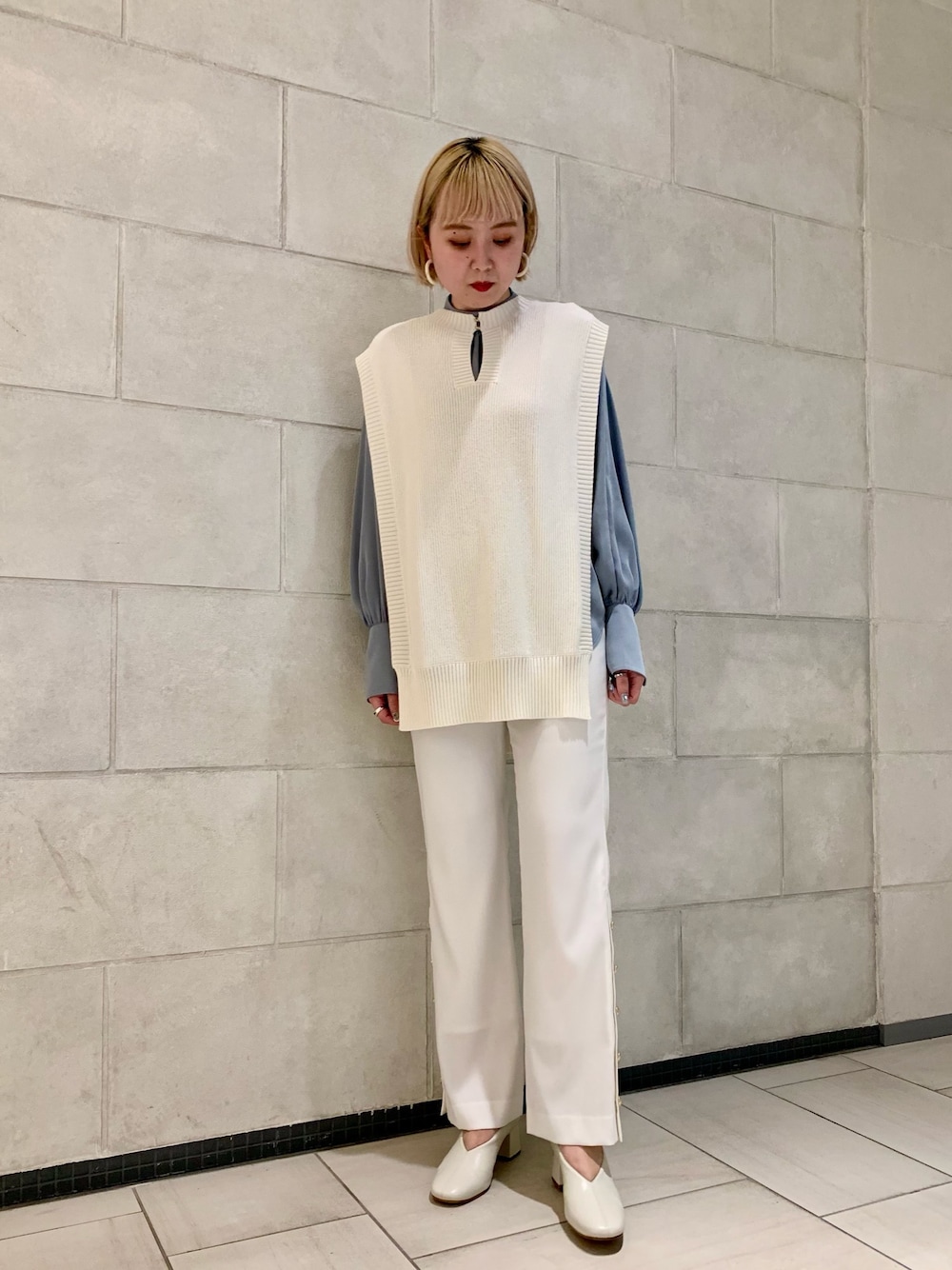 春らしいホワイト×ライトブルーのコーディネート。ニットベストからカラーブラウスをちらっと覗かせて洒落感のあるレイヤードがおすすめ!