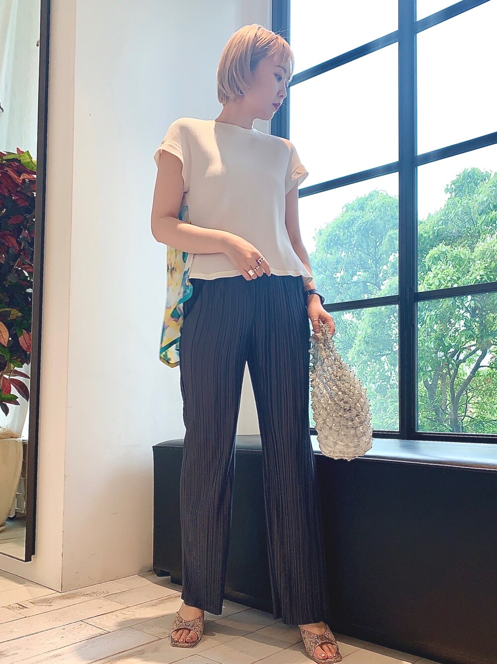 バックスタイルを見せたくなるカットソーは、シンプルなアイテムを合わせてスタイリングのポイントに!さりげなく足元にはパイソン柄のミュールで女性らしさを。