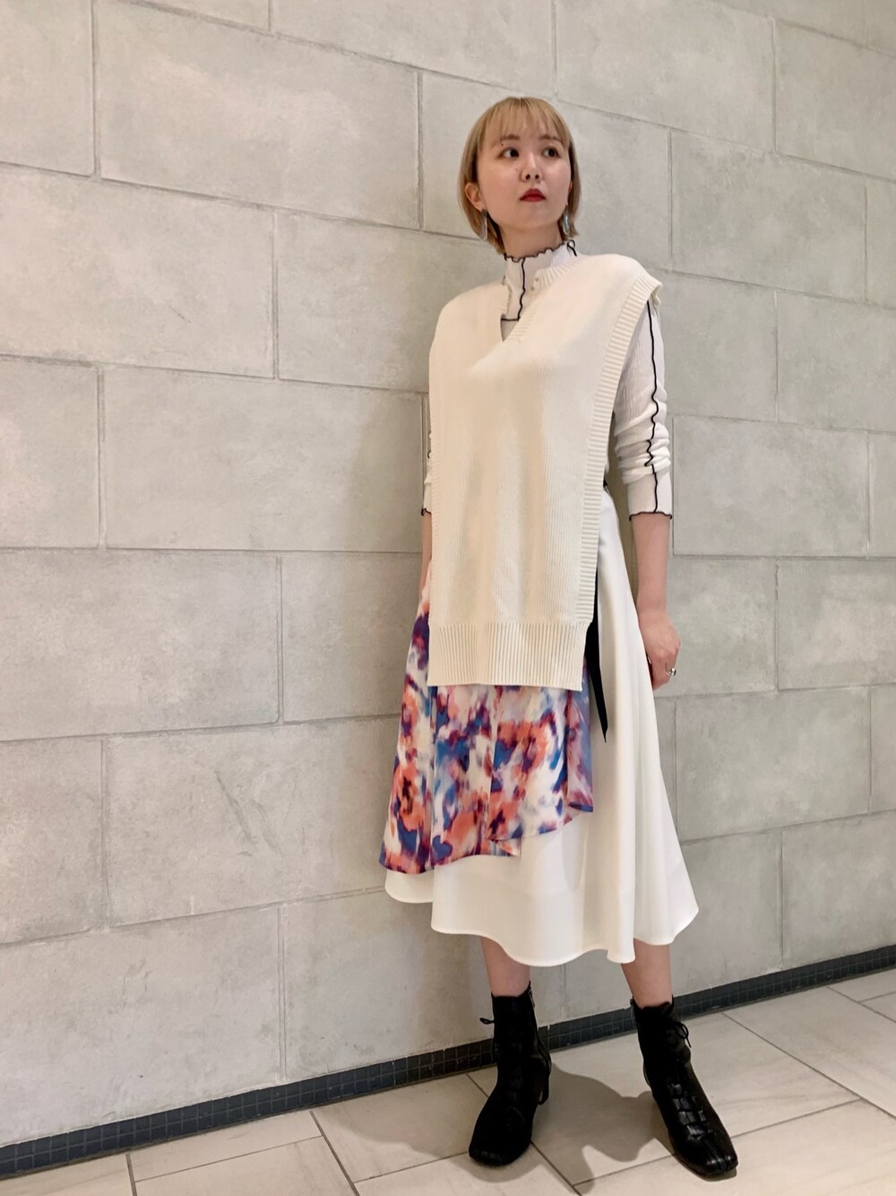 柄と色合いが華やかなスカートをニットベストからちらっと。