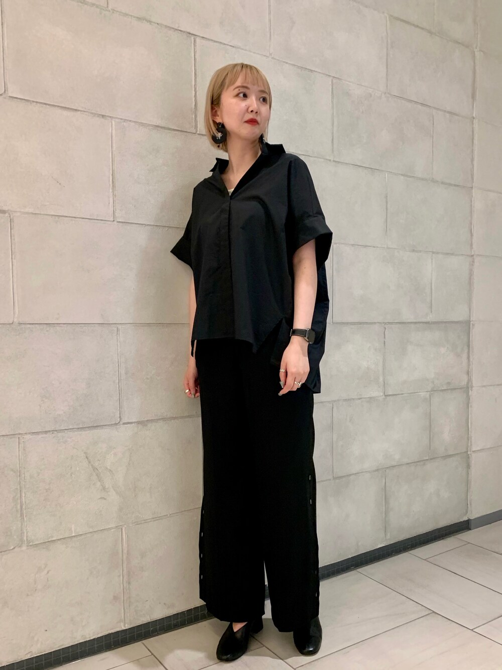 夏のオールブラックは肌見せと素材違いの着用がおすすめ。ブラウスは首元が綺麗に見え、サイドのスリットでどんなボトムスとも相性抜群です!
