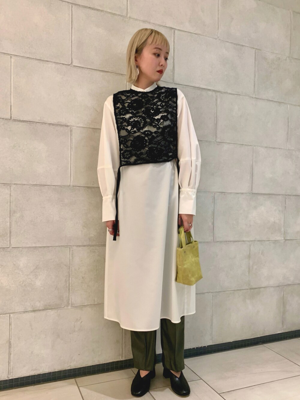 レースのベストがかわいいシャツワンピース。女性らしいアイテムにレザーアイテムを合わせるのがおすすめです!