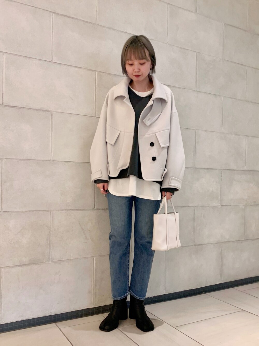 ライトグレーのアウターは春先取りで今すぐ着れるおすすめアイテム! デニムパンツを合わせてカジュアルな印象なので、小物はレザーでモード感をプラス。