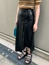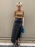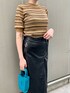 シアー素材のボーダーニットはコンパクトなシルエットなので、Aラインのスカートに合わせ たコーディネート。ブルーのバッグをワンポイントに。