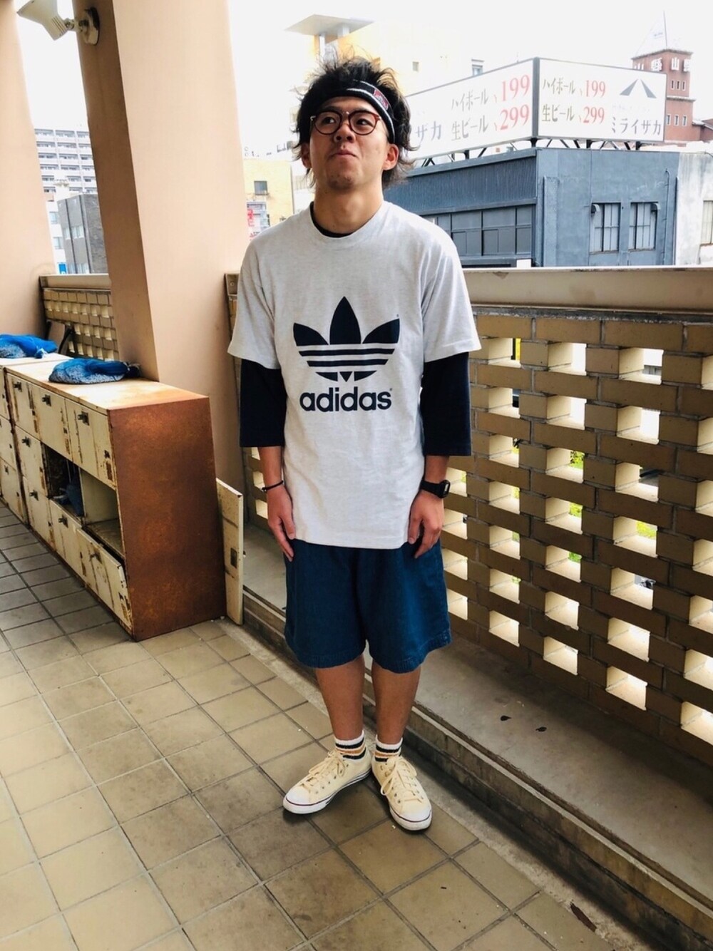 usedのadidasTシャツにデニムのハーフパンツでやんちゃ感😎⭐️ BEN DAVISのヘアバンドがよいかんじ👌 インナーはラグランでそれだけでもかわいいけど、この日はインナーとして着てて、袖丈感がかわいい⭐️