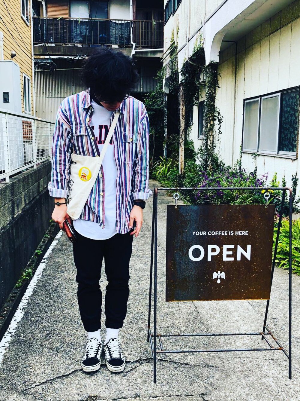 彼氏さんのシャツもおじさんみたいでかわいい⭐️ 中にはロゴ付きのラグランきてて、裾の出方がかわゆい〜 パンツは黒で締めて、足元は白靴下に VANSのチェッカーのオールドスクール、この靴は古着屋さんでみつけて、探してたものだから即買いしてしまったやつ⭐️ サイズが28くらいで大きいから足元が好きなゴツさになってよい! #used #THE BAWDIES #IL BISONTE #G-SHOCK #UNIQLO #VANS