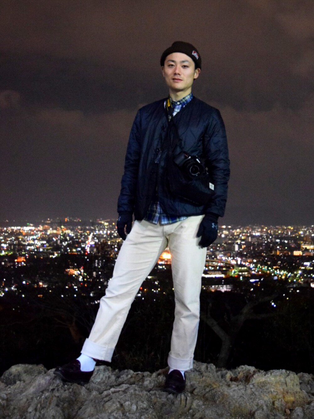 京都の夜景をバックに仁王立ち