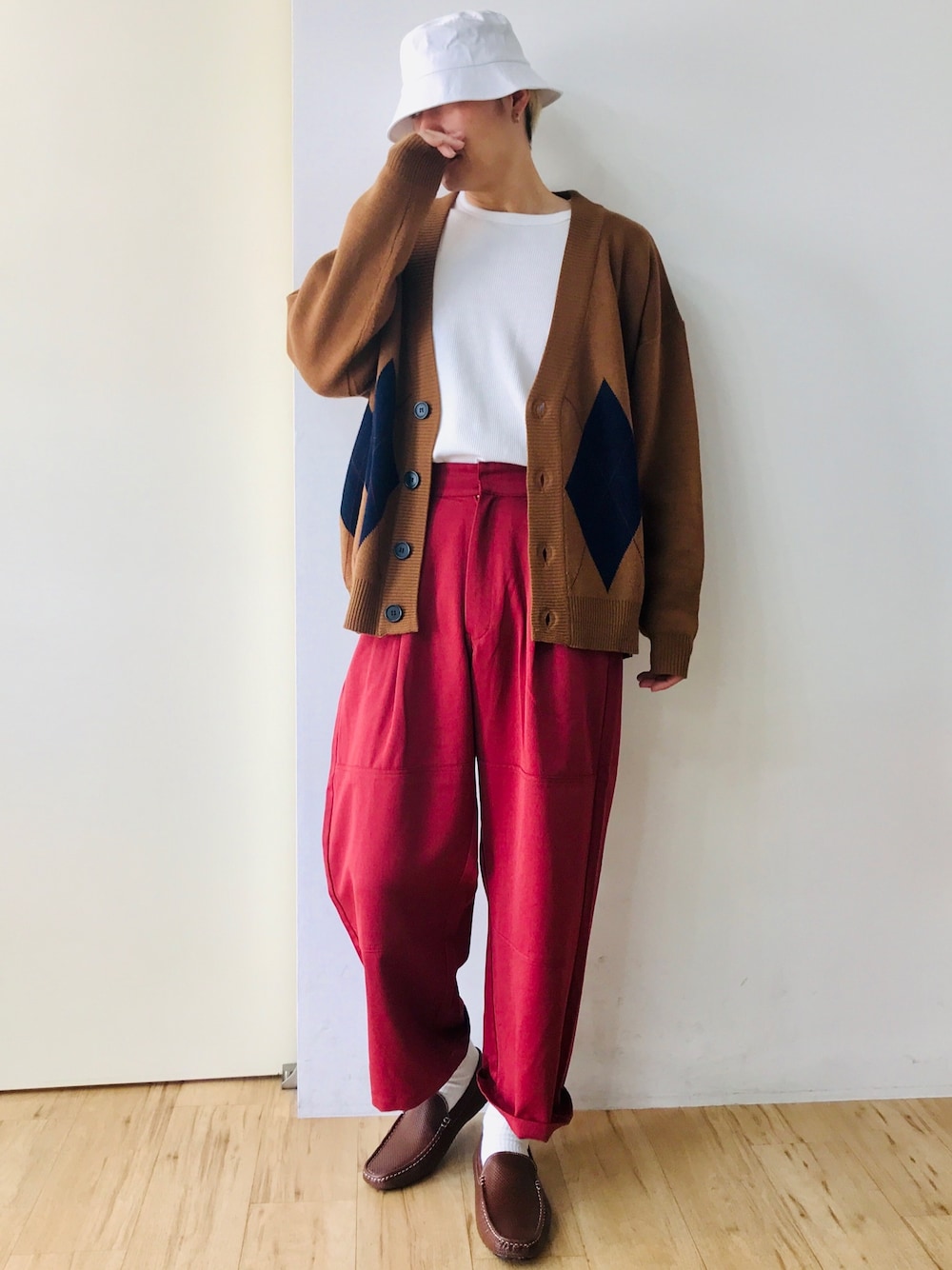 赤のパンツをメインに考えたコーデ😁 パンツ kutir サイズスモール ウエスト72 だと ハイウェイで履いて落ちてこないね👍 アウターにWEGOのだぼだぼカーディガン ブラウン ハット、インナー、ソックスを白で少し軽さを出して 足元はブラウンでもう一度締め😁👍 この白ハット 好きやわ〜😘 🌈今日の格言🌈 人にものを教えることはできない。 みずから気づく手助けができるだけだ。 - ガリレオ・ガリレイ -