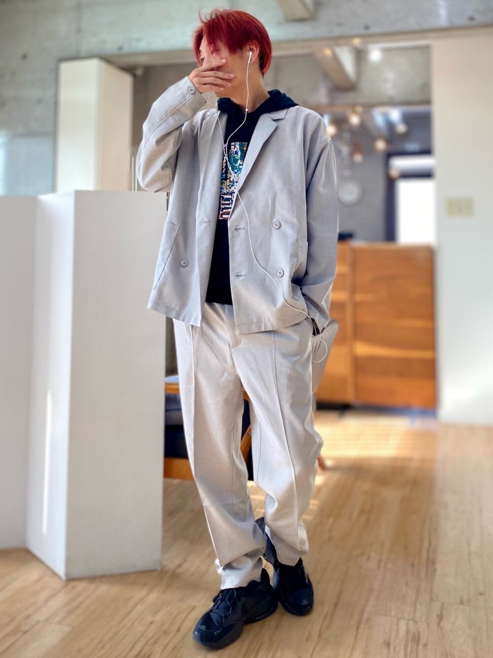 チョキさんのスラックス「ポリエステルポプリン / ワイド テーパード パンツ ウエストゴム(セットアップ対応)」を使ったコーディネート