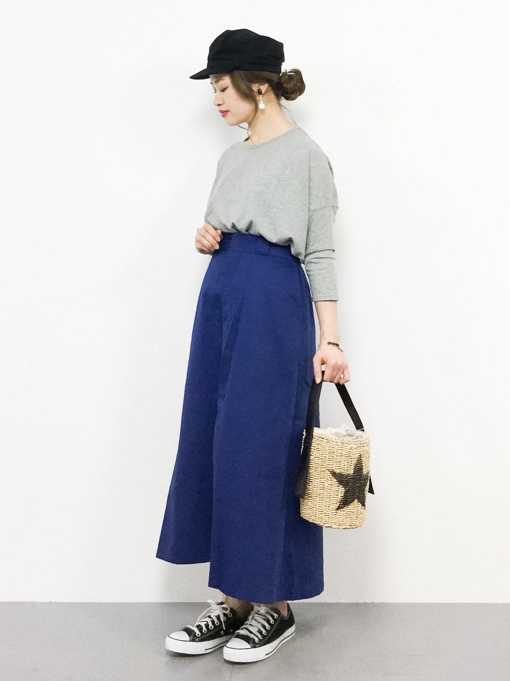 ぱりっとした質感のフレアスカートはボリュームがあるのでトップスインスタイルがおすすめです♪
