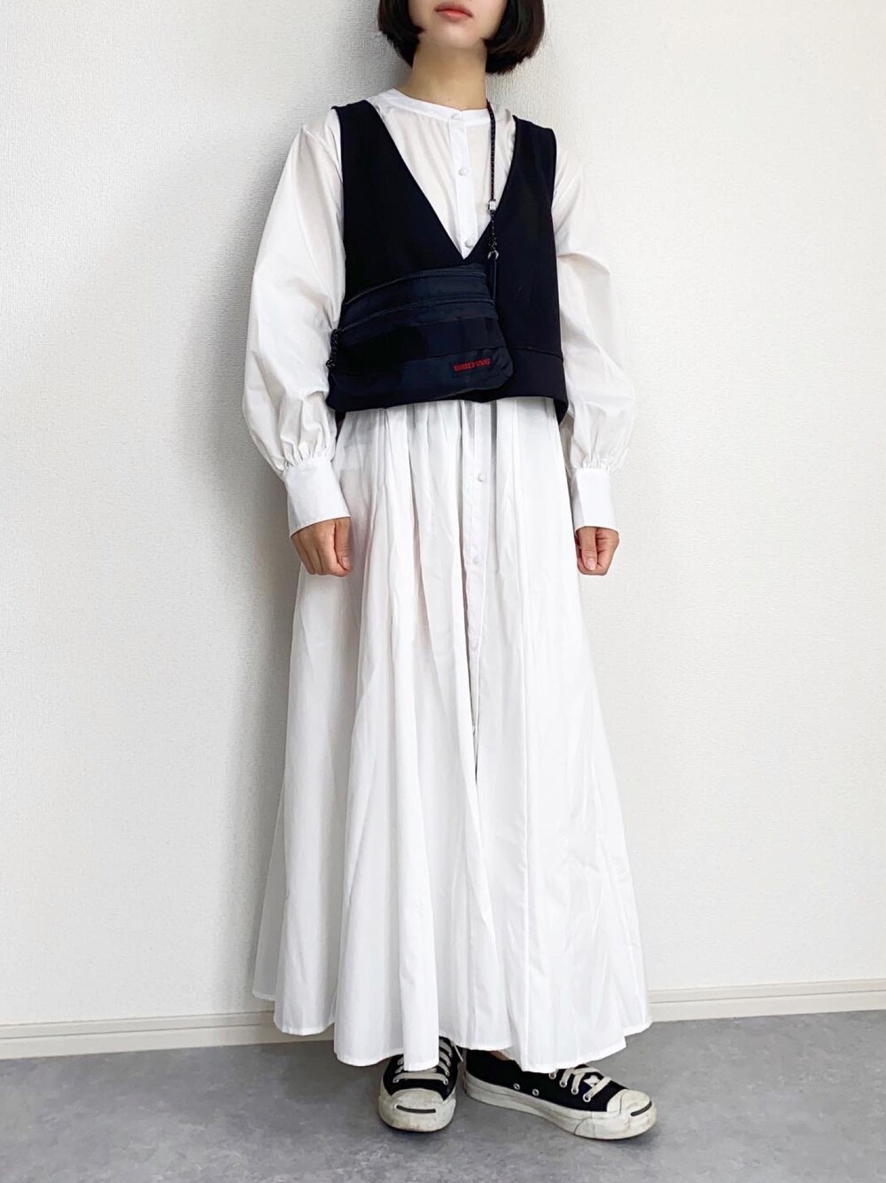ボリューム感のあるワンピース 引き締めカラーやメンズライクな小物で ナチュラル感薄めるといい感じ ワンピースはECRIRとyun_wearさんのコラボです♡