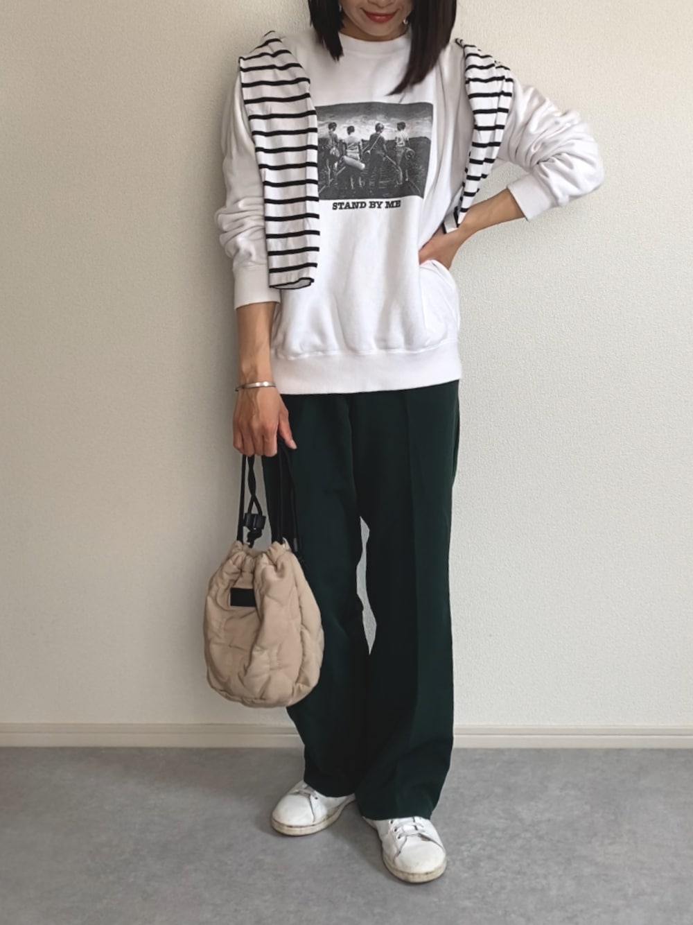 スウェットコーデ ボーダーのトップスをアクセントにすっきりと この日はお家でたこパだったのでたこ焼きみたいなバッグで🏉