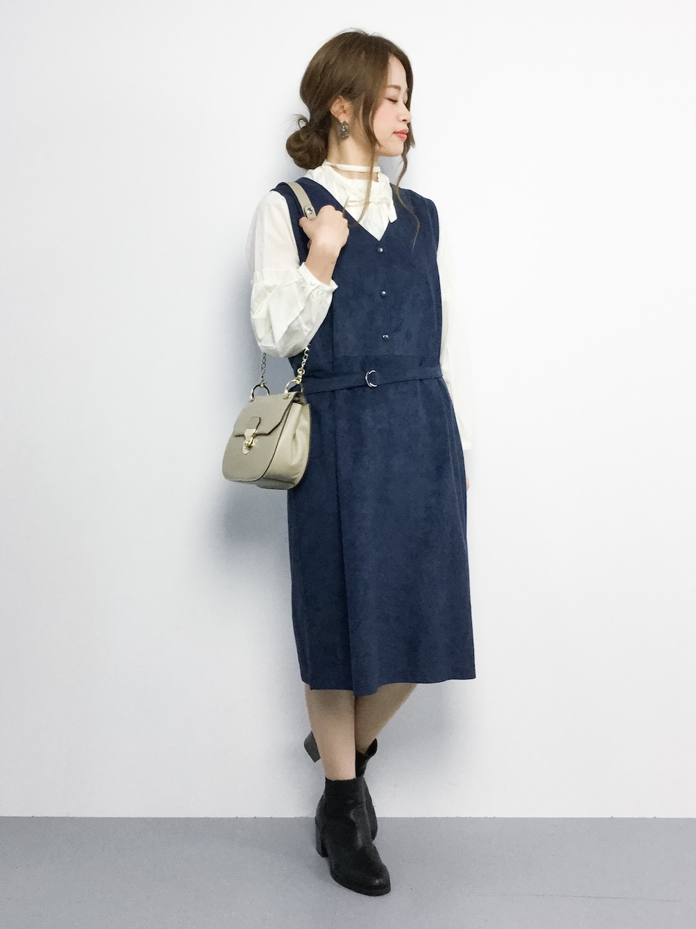 ジャンパースカートとレースシャツのクラシカルコーデ