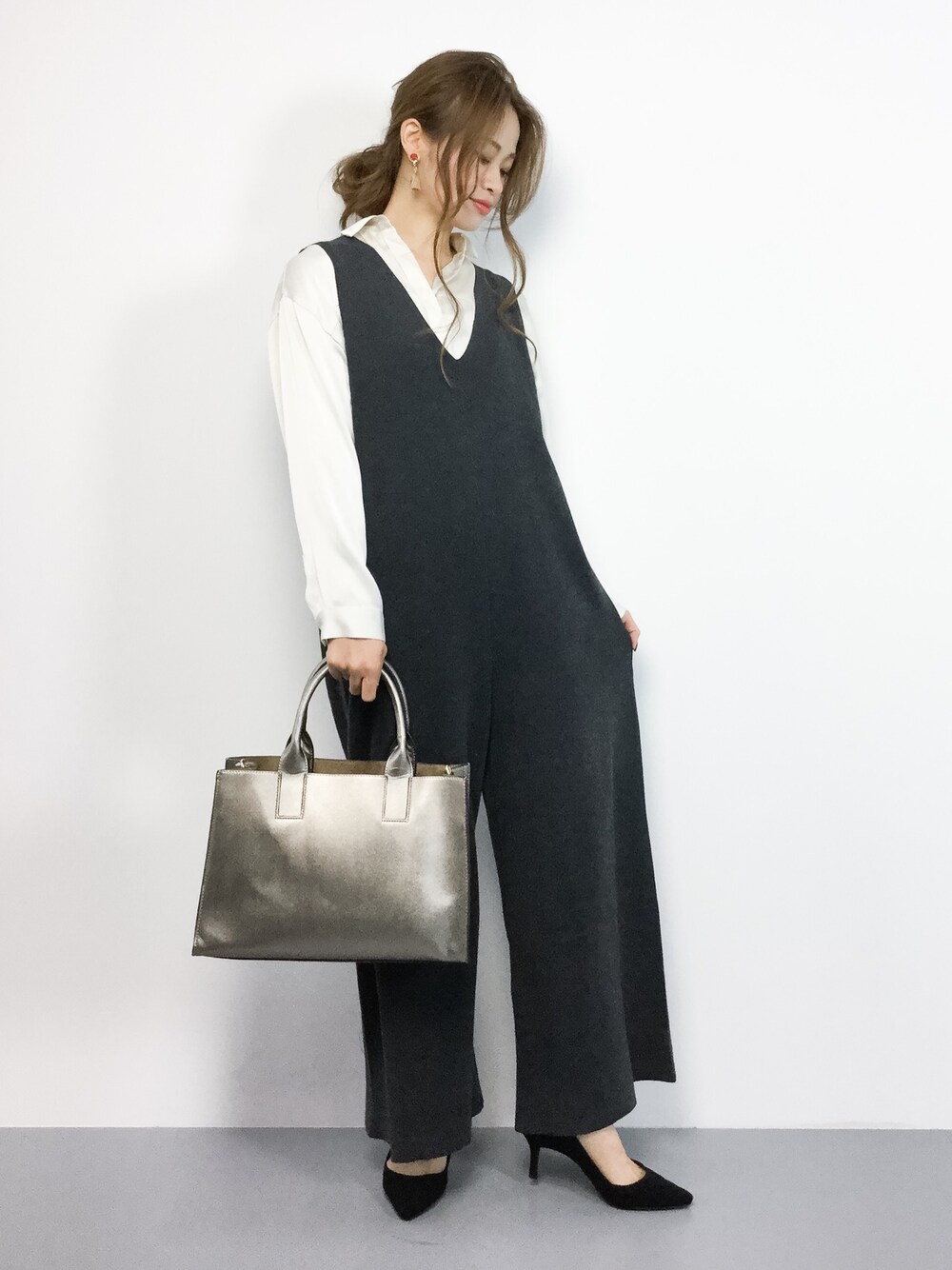 ニット素材のオールインワンとシャツを合わせた大人カジュアルコーデ
