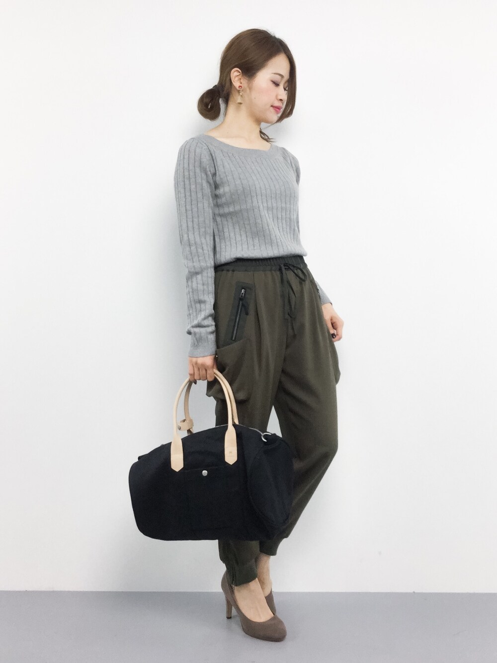 リブニットとイージーパンツのカジュアルコーデ