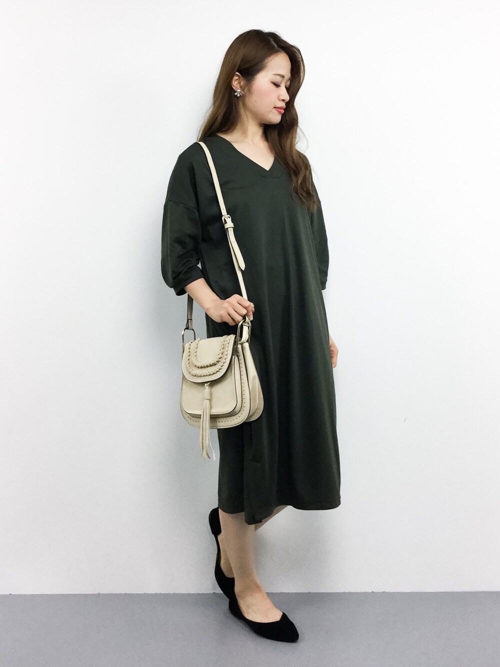 Vネックポンチワンピースの大人カジュアルコーデ