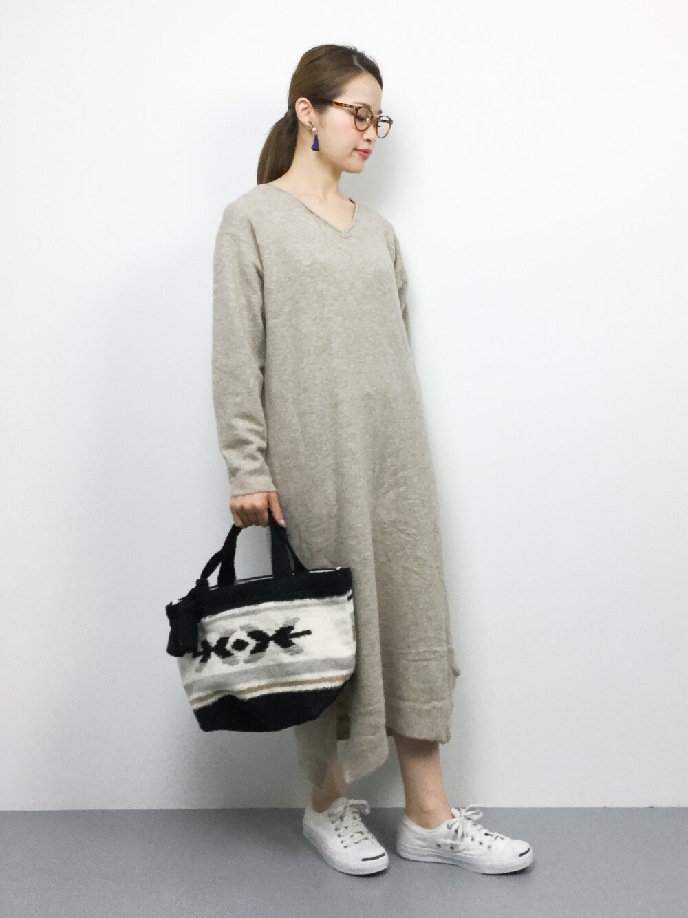 Vネックワンピのリラックススタイル