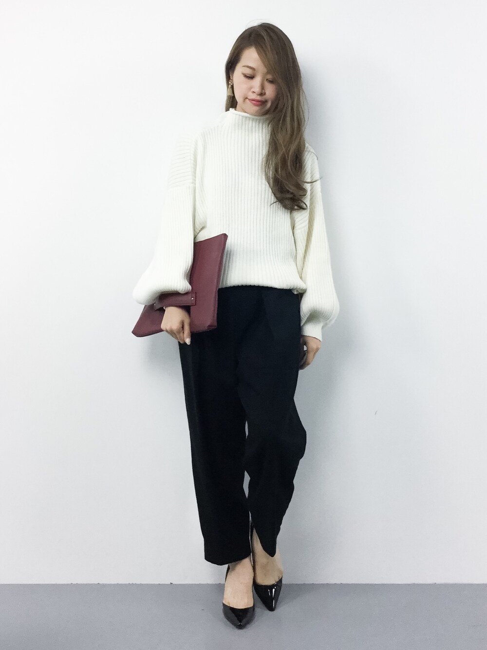 袖バルーンニットとテーパードパンツのカジュアルコーデ