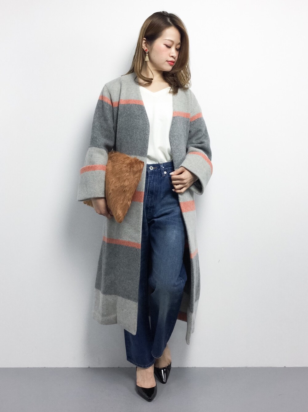 ガウンコート×ニット×デニムパンツ