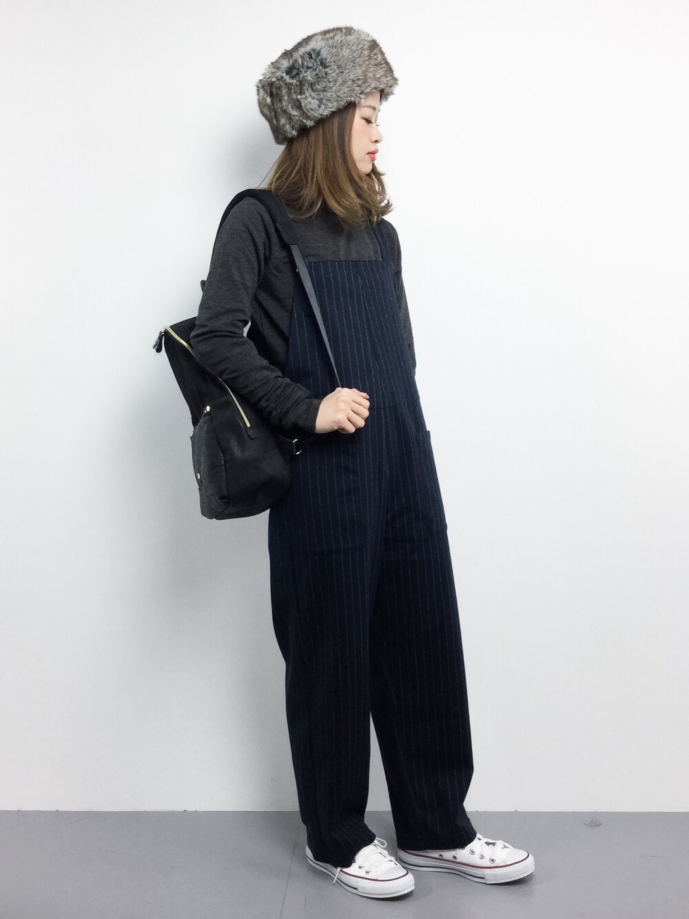 タートルネック×オールインワン×ファー帽子