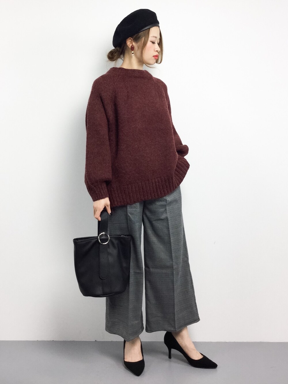 ビッグスリーブニット×ワイドパンツ×ベレー帽