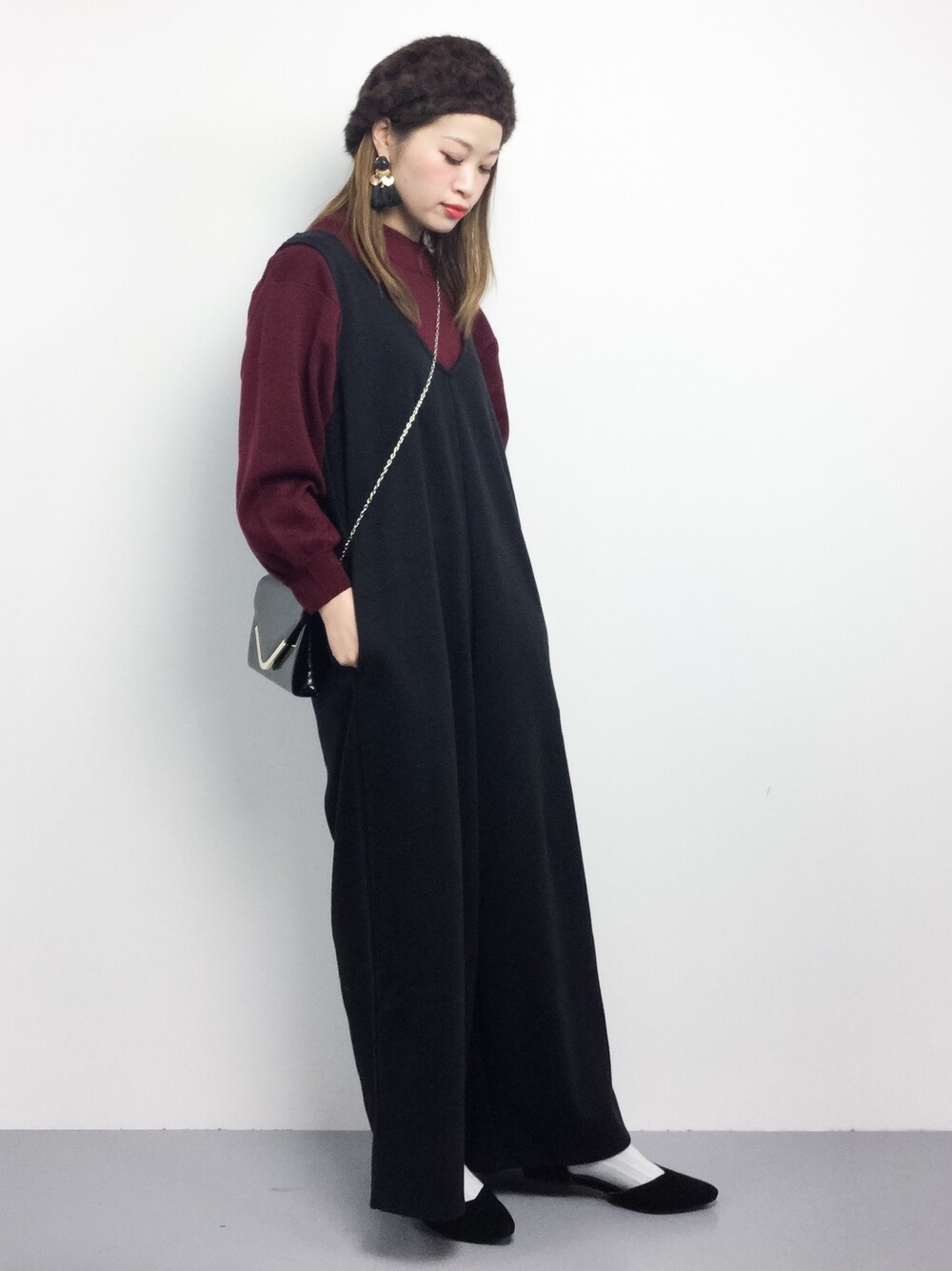 ボリュームスリーブニット×Vネックオールインワン×ベレー帽