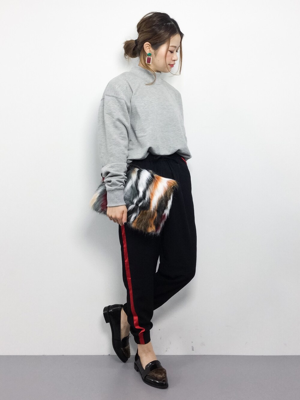 スウェット×ジョガーパンツ×ファークラッチ
