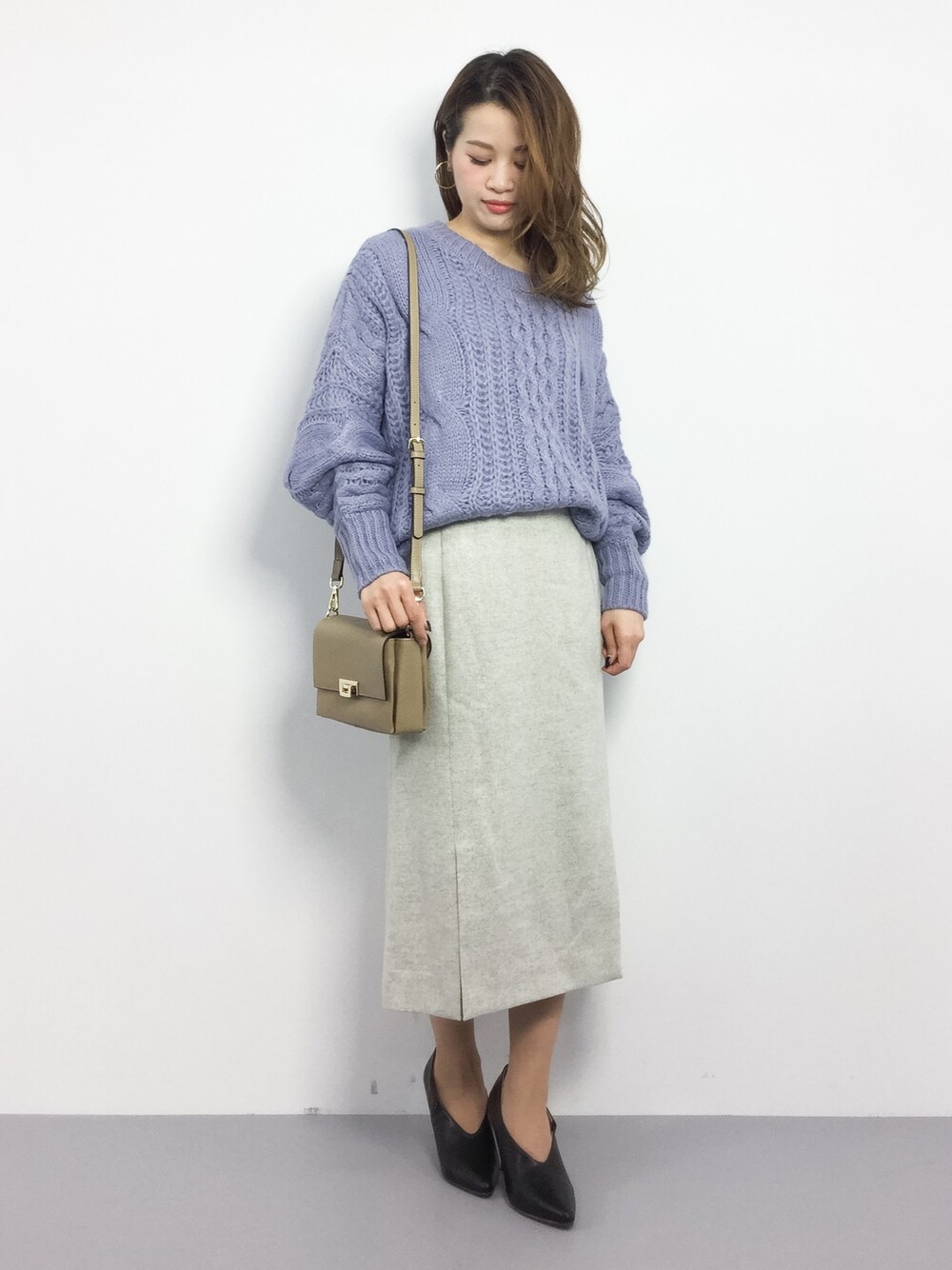 isaのニット/セーター「ビッグケーブルの女っぽドルマンニット」を使ったコーディネート