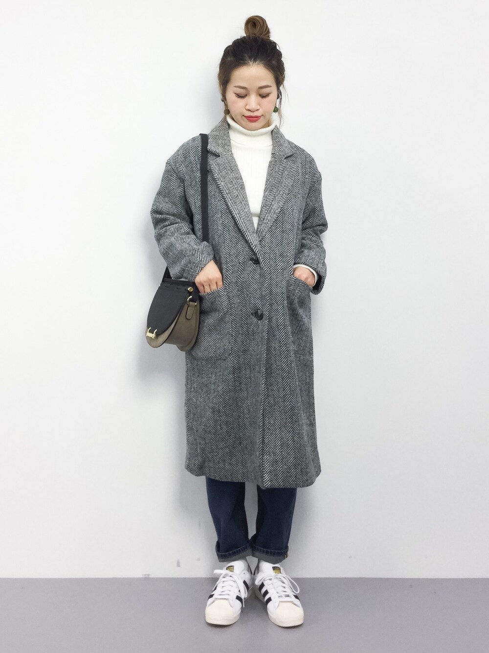 ツイードのチェスターコートをカジュアルアイテムで合わせました♪