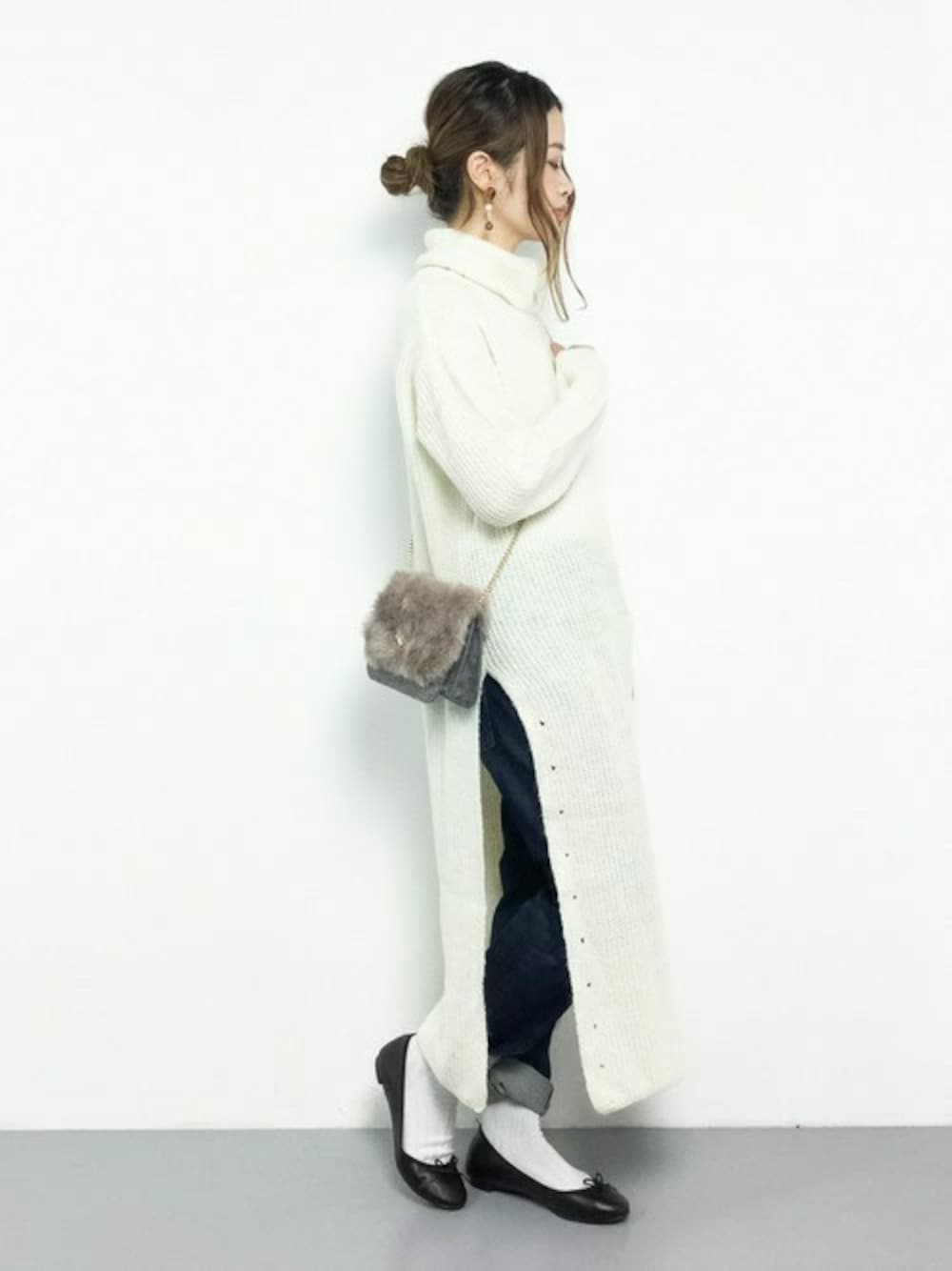isaのワンピース「サイドスリット入りざっくりオフタートルニット長袖ロング丈ワンピース」を使ったコーディネート