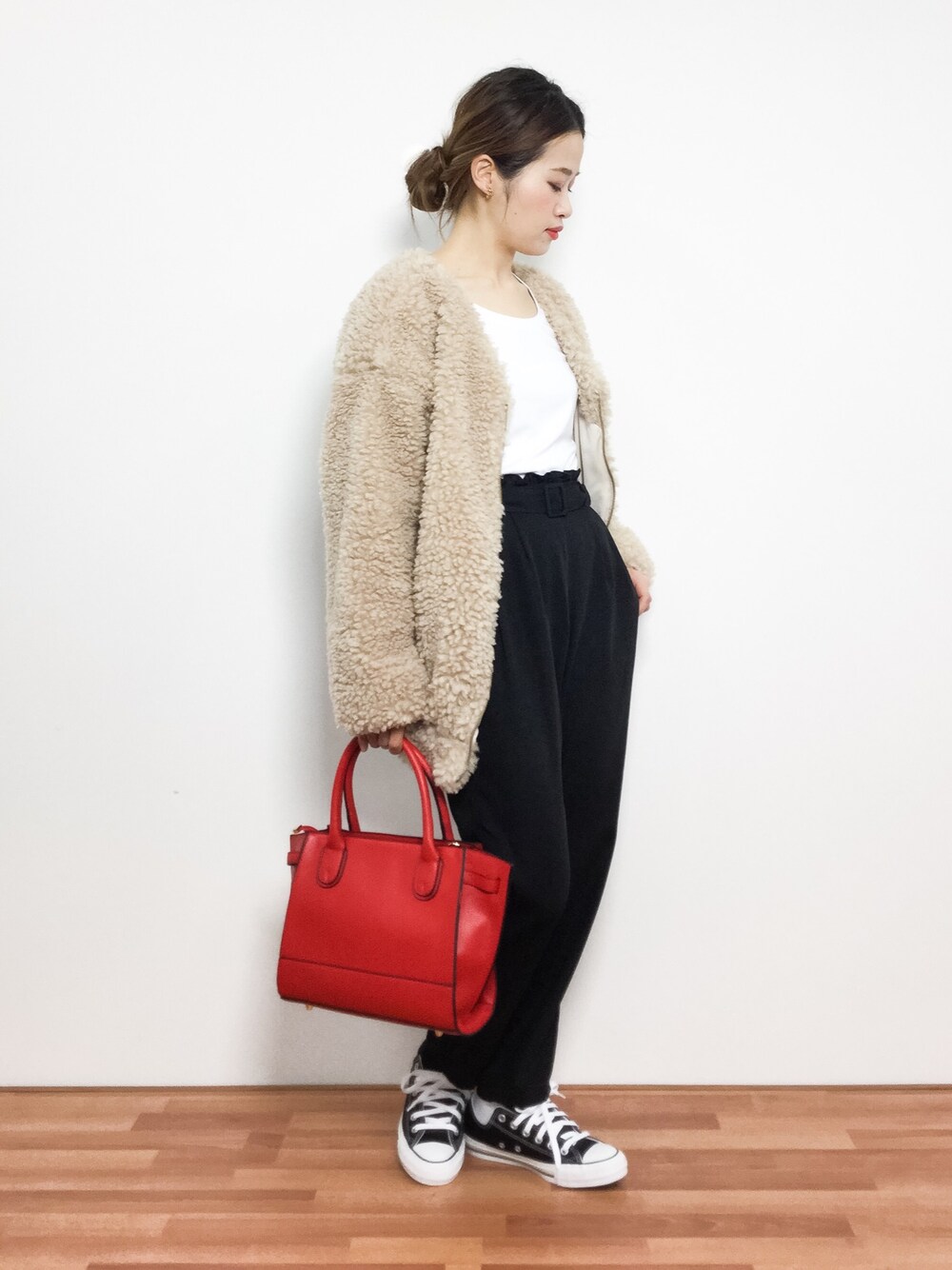 もこもことしたボリュームのあるアウターなので、コクーンパンツですっきりとしたコーデにしました!