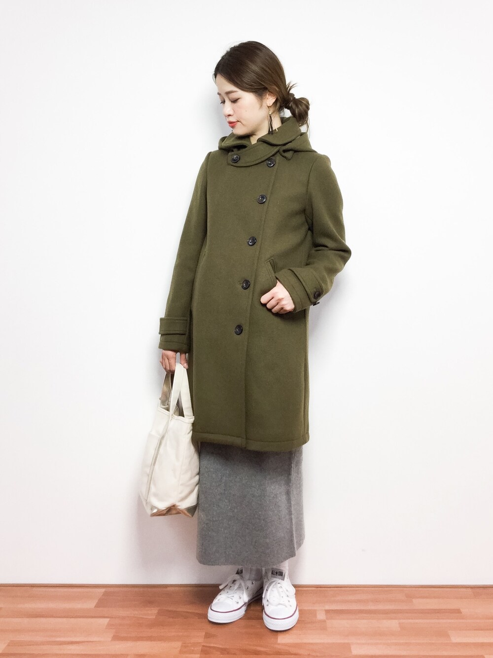オトナカジュアルコーデ◎ デザイン性のあるコートで前を閉めたシルエットも可愛いです!