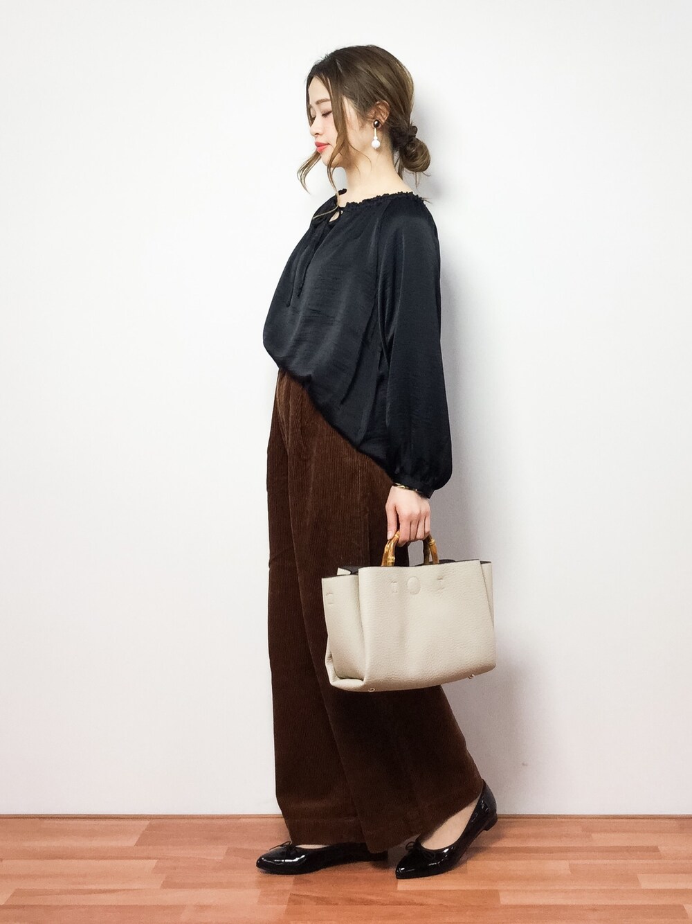 大人カジュアル◎ サテンのブラウスはしなやかな質感で首元のデコルテがオトナっぽい雰囲気です♪