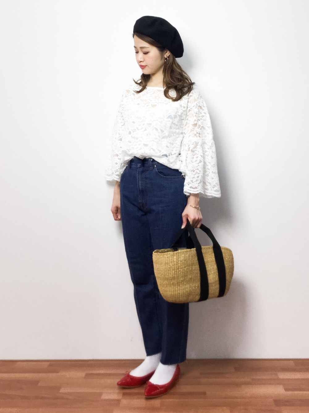 カジュアルコーデ◎ 甘めなレーストップスなのでデニムパンツやベレー帽でカジュアルダウンさせました♪