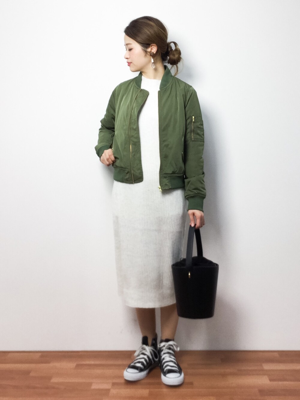 カジュアルコーデ◎ MA-1にニットワンピースを合わせたコーデ 足元はブーツも合うと思いますが今回は春を意識してスニーカーを合わせてみました♪