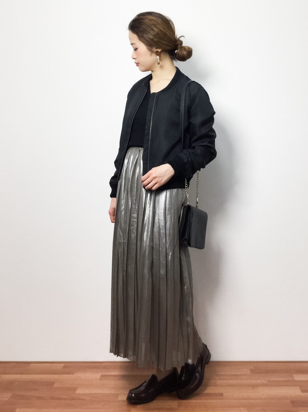 カジュアルコーデ◎ シルバーのメタリックカラースカート スカートが主役なので他はオールブラックでまとめました♪